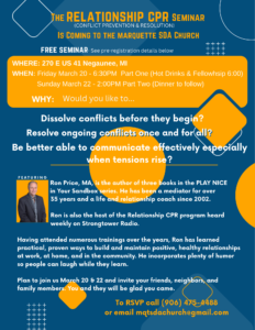Many have enjoyed Ron’s “Relationship CPR” program and thousands have experienced his seminar in person. Don’t miss this life changing event Friday, March 20 at 6:00 p.m., and Sunday, March 22 2:00 p.m. at the Marquette Seventh-day Adventist Church.