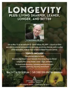 Dr. David Derose, MD,MPH-a board certified specialist in internal and preventative medicine, practicing clinician and co-author of the bestselling book 30 Days to Natural Blood Pressure control will present Reversing High Blood Pressure Naturally, Longevity Plus: Living Sharper, Leaner and Better, and The Brain Health Revolution to Optimizing mental performance, preventing Dementia & improving Mental Health. There is no charge for these lecture series.