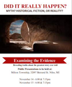 Did the resurrection really happen? Is it myth? Historical fiction, or reality? Join Pastor Justin for Examining the Evidence, a revealing examination of the greatest story ever told held in Niles at the Milton Township Hall, 32097 Betrand Street, November 14 and 15 at 6 and 7:15 p.m. Four hard hitting sessions Establishing the Text, Jesus of Faith and History, Messianic Prophecies, and The Resurrection’s Aftermath!