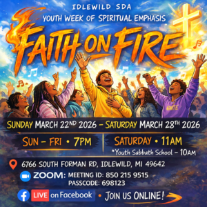 Young people, Faith on Fire is for you, it is a week of spiritual renewal lead by young people nightly beginning Sunday, March 22 at 7 pm with a finale Saturday morning at 11 am plus a Youth Sabbath School at 10 am. It hosted by the Idlewild Seventh-day Adventist Church. Join us by streaming on the Idlewild Church’s Facebook page or Zoom at meeting 850 215 9515 passcode 698123. The final day, March 28th, we will host an in-person option at the church, just east of Baldwin at 6766 South Forman Road.